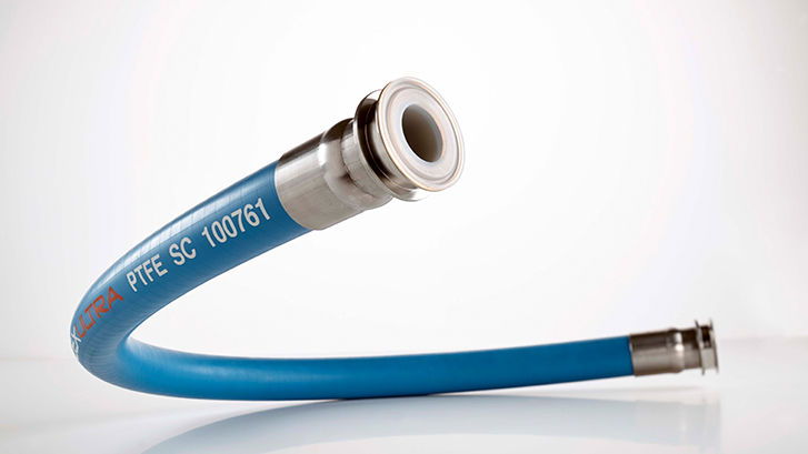 The Bioflex Ultra configuration selected by this customer is GP, AS, SS and RC, with PTFE-lined sanitary Tri-Clamps. The customer was made aware that some of the products being processed (such as face cream) were at risk of static electricity build-up and discharges, as well as potential hose failure due to the cleaning process. The PTFE lining recommended contained 2.5 % carbon, providing antistatic properties.